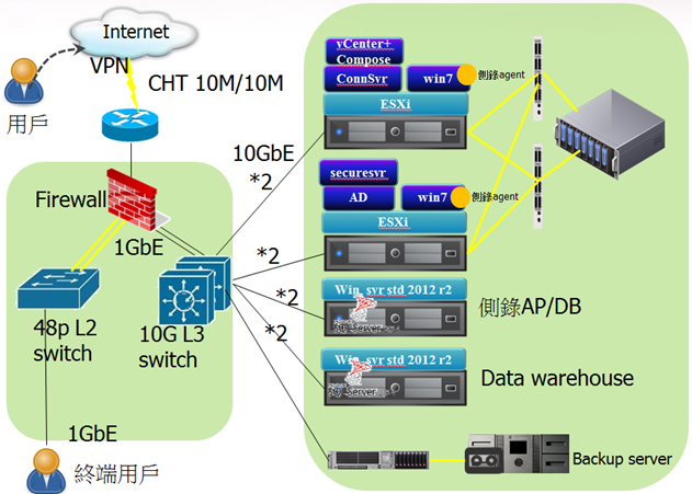 E公司參酌同業現況與泰鋒建議後決定採用 VMWare Horizon 建置 VDI 集中控管使用者個人電腦。終端使用者經過防火牆登入虛擬桌面後,才能執行相關分析應用。登入後的操作畫面有側錄軟體記錄保存,以供事後稽核。資料中心內的兩部10G網路交換器建置設定高可用度。設定存取政策限制使用者將資料寫入USB,限制使用者執行 複製/貼上 功能。